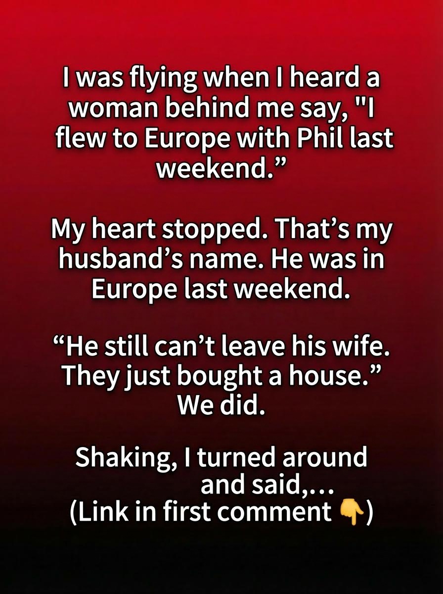 The flight had been quiet, the kind where the steady hum of the engine lulls everyone into their own thoughts. I was staring out the window, replaying ordinary details of life—work emails, grocery lists, the excitement of settling into our new home—when a conversation behind me broke through the calm. A woman’s voice floated forward, casual and confident, mentioning a recent trip to Europe with someone named Phil. At first, it barely registered. Then my chest tightened. My husband’s name is Phil, and he had been in Europe just the weekend before. I told myself it was a coincidence, the kind you laugh about later, but my hands had already gone cold.