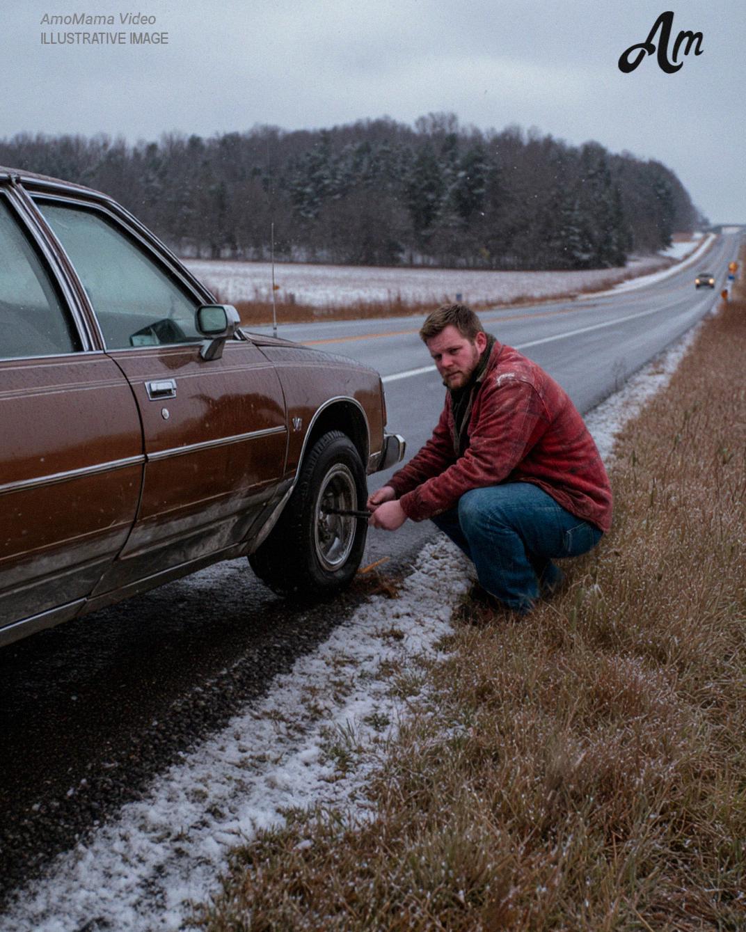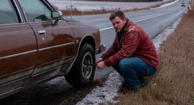 The car looked like it had survived a dozen winters too many. Beside it stood an elderly couple, wrapped in thin jackets that the wind sliced right through.